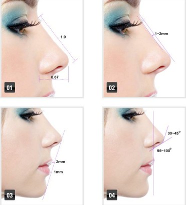 精致无可挑剔的鼻型,应遵守鼻子应为面长的1/3,鼻长约为6~7.5厘米;鼻根部宽约1厘米,鼻最大宽度,即两侧鼻翼侧缘之间距为鼻长的70%,鼻高约为面长的1/3,符合三庭五眼比例关系;鼻根部鼻梁高度为男性平均12毫米,女性平均11毫米。