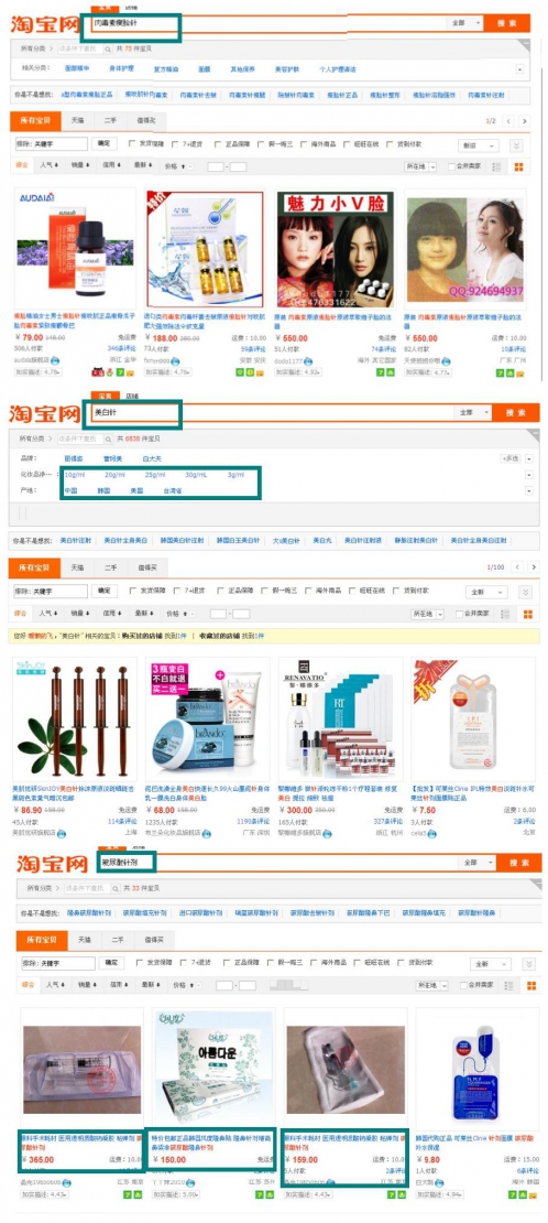 网购的确给我们的生活带来了极大便利,但也成为提供非法注射美容产品的温床。针对时下MM们热捧的三大“美容针”——瘦脸针(肉毒素)、美白疗法、玻尿酸,小编在淘宝网上进行搜索,结果各自都出来数十页甚至上百页产品,价格数十元、数百元的都有,少有上千元,啥牌子的都有,韩国的、台湾的、美国的、德国的……。真的有人买么?还真有!虽然不像其它生活用品那么畅销,但多数产品下有交易记录,少的几条,多的有200多条!