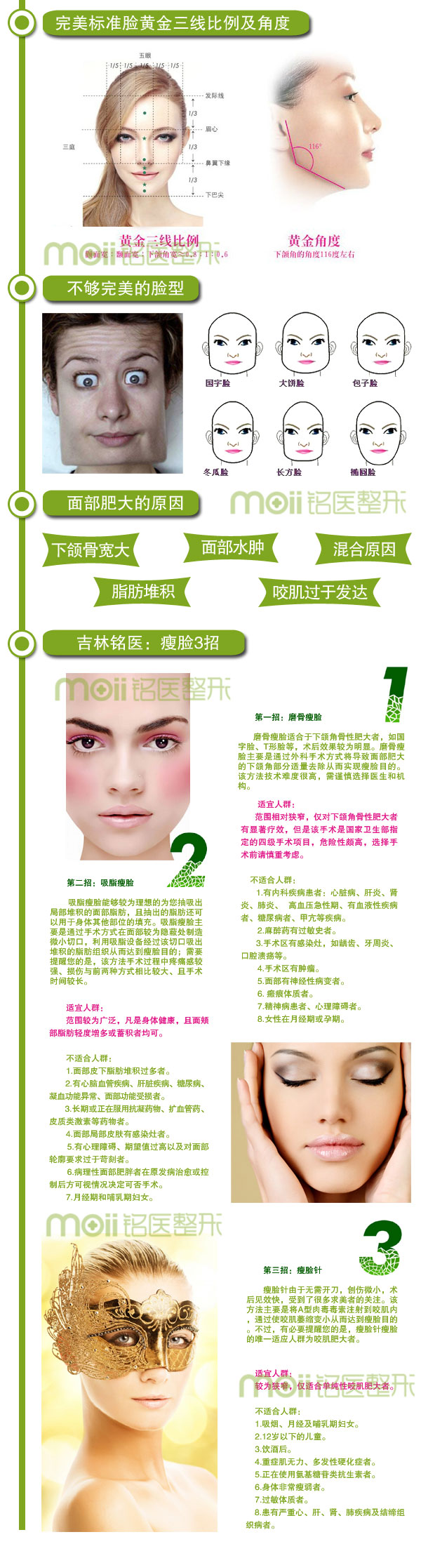 吉林铭医整形通过一图张与您分享详细、综合、专业的瘦脸相识知识,以及解决方案,让求爱人士不再为如何瘦脸绞尽脑法,轻松拥有一张人见人爱、花见花开的迷人小脸蛋。