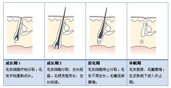由于种族、遗传与性别差异,毛发的颜色与粗细不同,使得有些人看起来毛又多又长,而有些人则光溜毛少,另外,身体各部位的毛发粗细也不同。毛发的生长速度平均为一天长三分之一毫米,那么,它正常的生长周期是怎样的呢?下图可以形象得为你解读:
