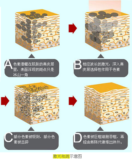 激光祛斑是通过激光美容仪发射特定波长的光,激光聚集的高能量将色素分解击破,伴随着人体正常代谢排出体外,从而达到祛斑美白的效果。由于特定波长的光只能被色素部位吸收,因此激光祛斑不会伤害肌肤正常部位。