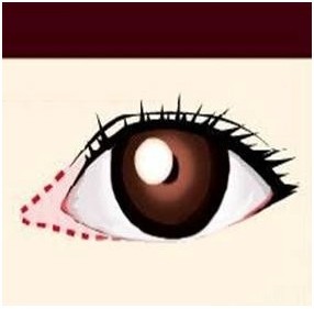 正常情况下,粉色的泪阜肉眼可见的,但当内眼角部位有赘皮时,就会遮挡泪阜,让眼睛变小,简单的说,开眼角手术(一般都开内眼角)是在内眼角部位设计合适的切口,将内眼角多余的赘皮切除,缝合在如图虚线位置,将内眼角往鼻部迁移,使深藏的粉红色泪阜展现,从而拉长眼眶的范围。