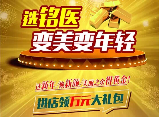 想要引领全场至美焦点,就要抓住新年整形美容黄金期,告别平庸的自己,选铭医变美变年轻,3重大礼迎新春!1重礼:超值大礼包;2重礼:折扣大放送;3重礼:送黄金。