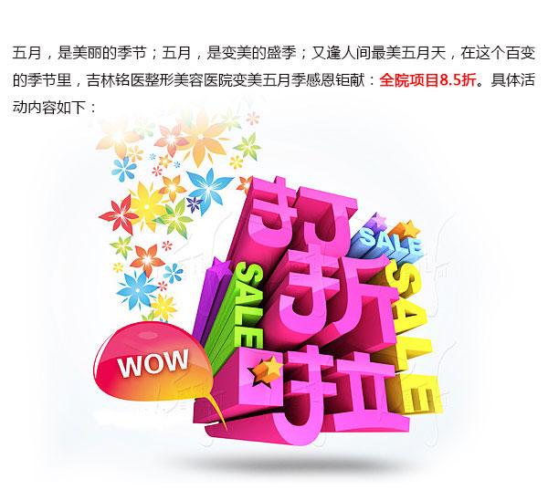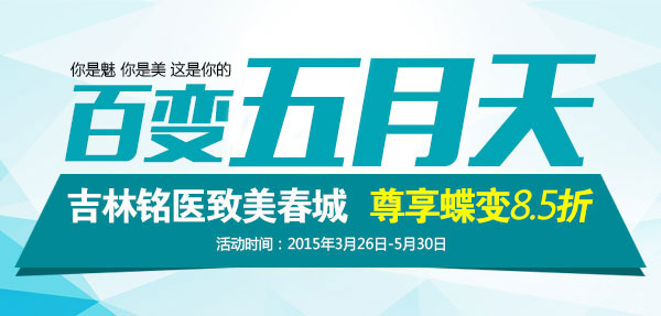 吉林铭医整形美容医院变美五月季感恩钜献:全院项目8.5折。活动内容如下:丰胸至高直减6000元;年轻化深蓝射频2000元;进口瑞蓝玻尿酸3980元/支;臻品润百颜玻尿酸2000元/支……