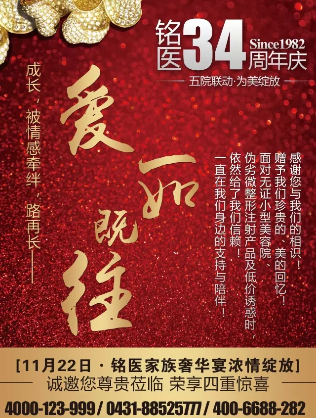 亲爱的家人们,今年我34岁 温馨晚宴,只想邀您一醉方休 共同见证铭医34载奢华蝶变 将时光的馈赠从容签收 亲爱的家人们,11月22日, 我们为您真心等候, 铭医34周年家庭晚宴, 我们期待与您再次深情聚首! 铭医家族34岁生日大趴, 从眼球到心灵的震撼, 狂撒百万,打造奢华盛宴, 有爱,任性! 34年,对