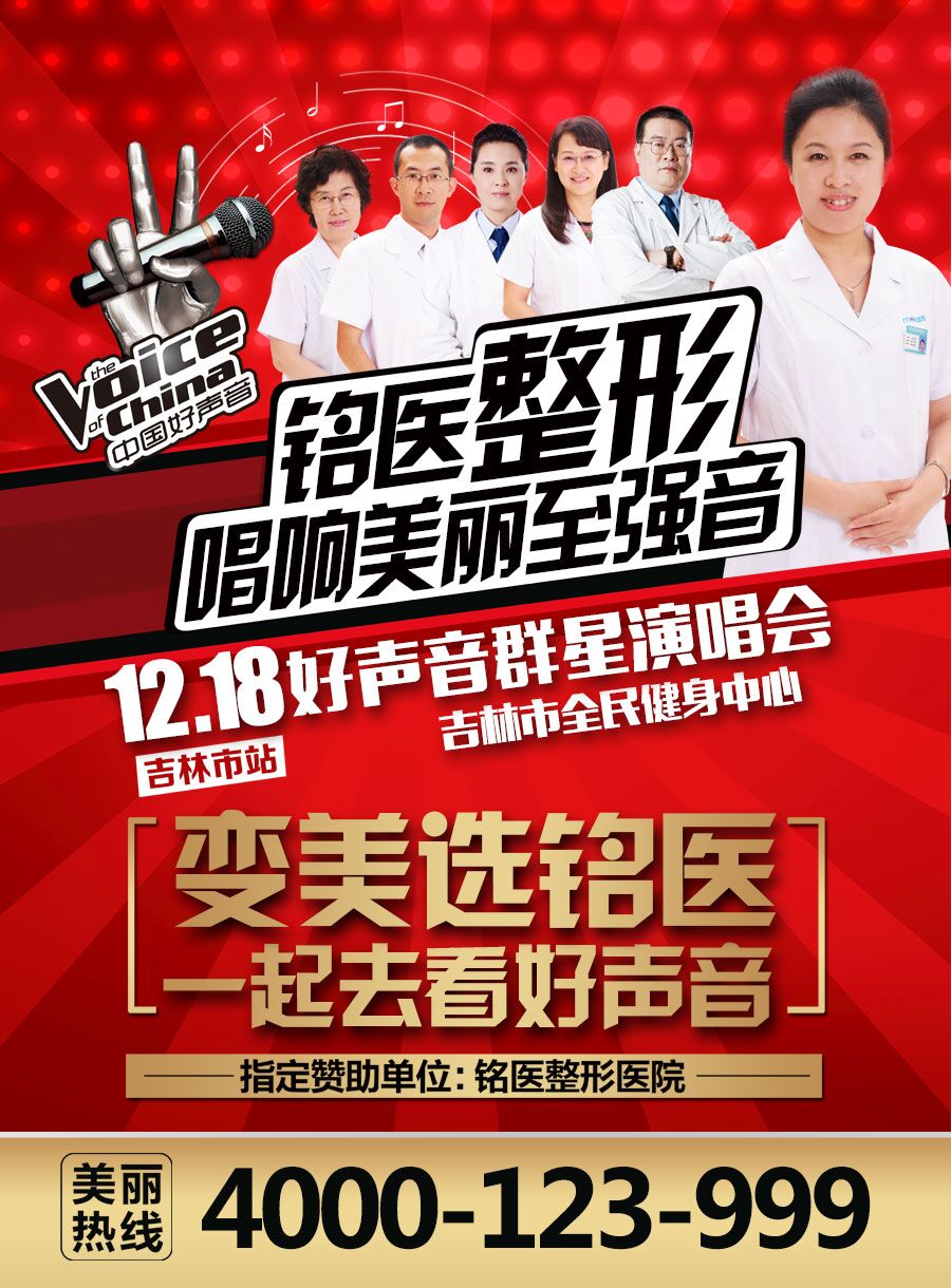 铭医整形,用美丽的体貌点亮眼睛,酿制心神的愉悦。 中国好声音,以美妙的声音征服耳朵,唤起灵魂的共鸣。 如果这两个至in至美的缔造者跨界联手,将会发生怎样神奇的化学反应? 12月18日,吉林市铭医整形美容医院即将携手《中国好声音》,演绎一场动人心魄的视听盛宴 中国好声音吉林之夜特别演唱