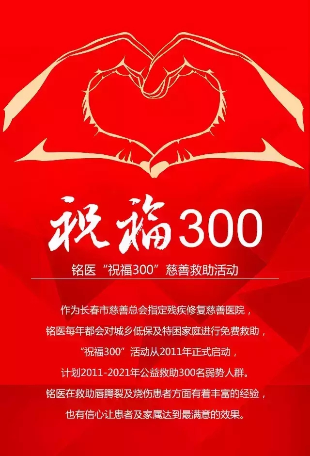 小滢滢这样的救助行动,对于铭医整形来说绝非偶然。34年来,铭医始终关注长春的慈善事业,免费救助烧烫伤、唇腭裂、颜面畸形等病例近千例。铭医整形董事长于钧女士说:“孩子是祖国的希望,我不能让他们因为容貌而失去了成长生活的勇气,帮助孩子们重拾自信与快乐是我的责任,也是我的义务。”