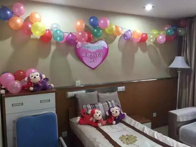 在208医院经过为期半个多月的治疗,小滢滢的身体状况逐步稳定,终于可以出院了,下一步便是按照原计划,到铭医进行整形修复。为了迎接天使回家,铭医的工作人员提前一天便已做好了布置,用一串串气球和可爱的小猴玩偶装扮着专为小滢滢准备的VIP病房,整个病房里洋溢着温馨的气息。