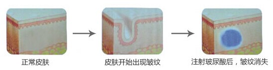 女性面部出现皱纹的根源在于体内玻尿酸的流失,玻尿酸一旦流失后,皮肤就会失去弹性和支撑力,进而出现松弛下垂,形成皮肤皱纹。将和人体透明质酸同源的玻尿酸注射到皱纹皮肤部位后,玻尿酸可以让皮肤处于保水状态,同时使得皮肤的弹性纤维和胶原纤维处于水润状态,恢复皮肤的弹性和活力,达到理想的除皱效果。