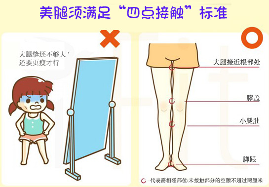 所谓“四点接触”的美腿标准,也就是姑娘并拢站立时,双腿的“接近大腿根部处”、“膝关节”、“小腿肚”和“脚跟”四点会相碰,其余则留下不超过两厘米的空隙即可。