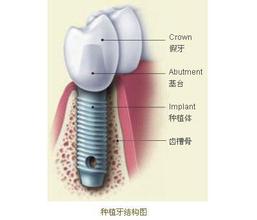 种植牙:是采用人工材料制成种植体(一般类似牙根形态),经手术方法植入组织内(通常是上下颌)并获得骨组织牢固的固位支持,通过特殊的装置和方式连接 支持上部的牙修复体。通俗地讲就是在缺牙的位置打一颗金属钉进去,几个月金属钉长好之后在上面做牙冠。种植牙和天然牙功能、结构以及美观效果十分相似。适 用于单牙缺失、多牙缺失及无牙颌。